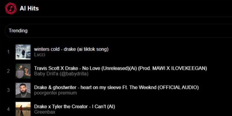 A ranking of the best songs created by AI. Possibility to listen directly to the music on the site, via SoundCloud or to download it